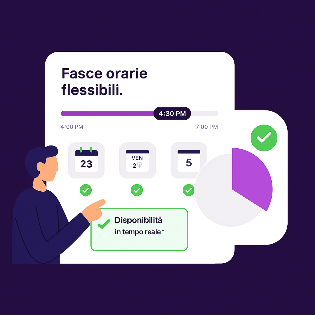 Fasce orarie flessibili. Disponibilità in tempo reale. Controllo totale da un’unica dashboard, senza complicazioni.