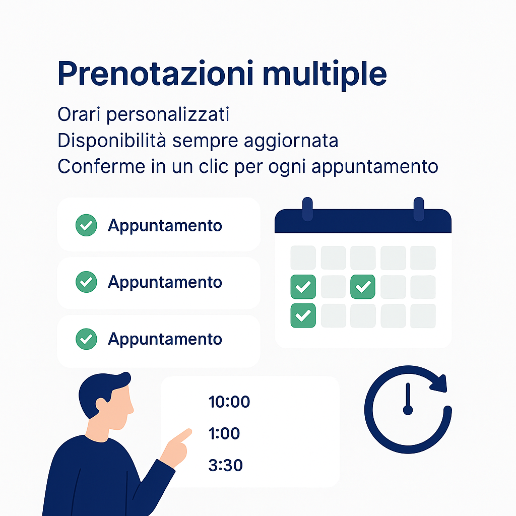 Conferme impostabili via email e WhatsApp. Calendario centralizzato aggiornato in tempo reale. Setup completo e assistenza diretta dal nostro team. Soluzione indipendente, senza piattaforme esterne.